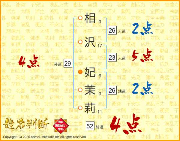 相(9画)沢(17画) 妃(6画)茉(9画)莉(11画)