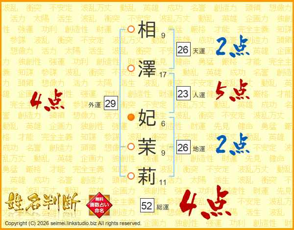 相澤妃茉莉さんの総運は52画の4点!