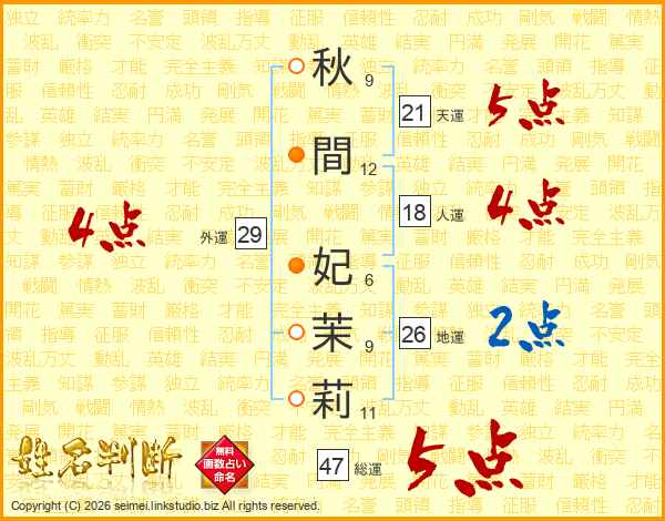 秋(9画)間(12画) 妃(6画)茉(9画)莉(11画)