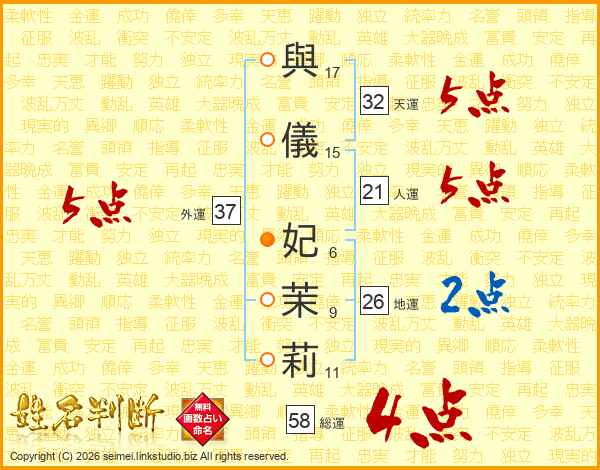 與儀妃茉莉さんの総運は58画の4点!