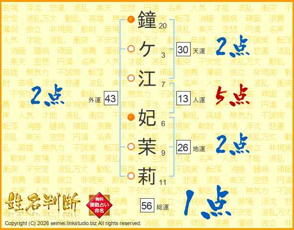 鐘ケ江妃茉莉さんの総運は56画の1点!