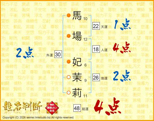 馬(10画)場(12画) 妃(6画)茉(9画)莉(11画)