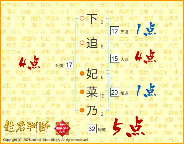 下(3画)迫(9画) 妃(6画)菜(12画)乃(2画)