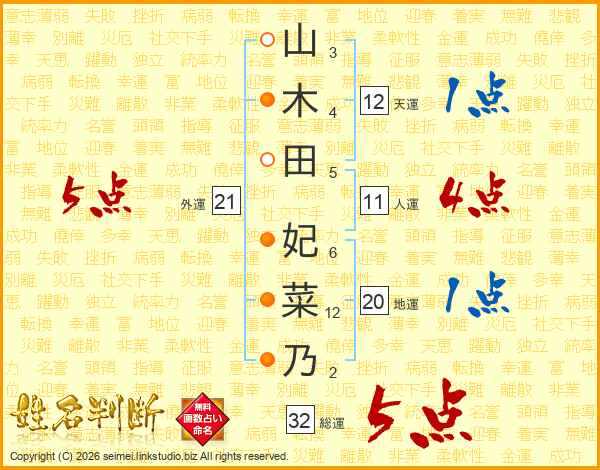山木田妃菜乃さんの総運は32画の5点!