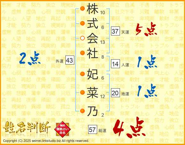 株(10画)式(6画)会(13画)社(8画) 妃(6画)菜(12画)乃(2画)