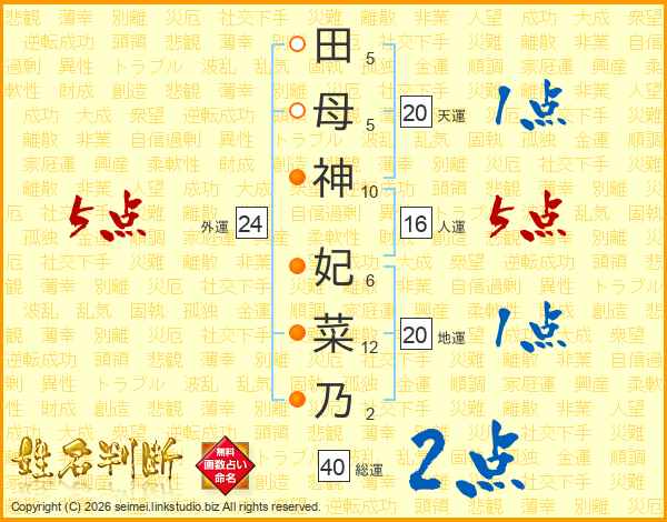 田(5画)母(5画)神(10画) 妃(6画)菜(12画)乃(2画)