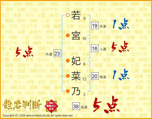 若(9画)宮(10画) 妃(6画)菜(12画)乃(2画)
