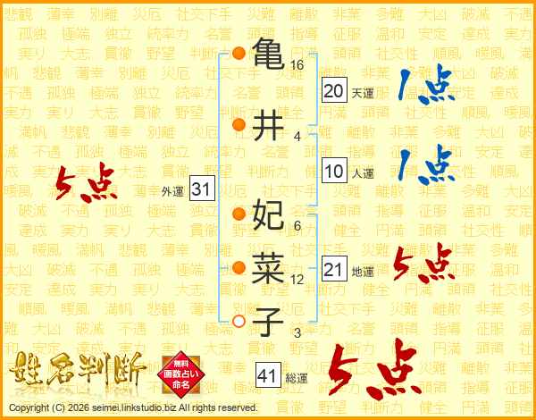 亀井妃菜子さんの総運は41画の5点!