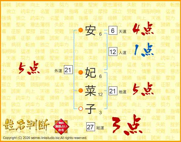 安妃菜子さんの総運は27画の3点!