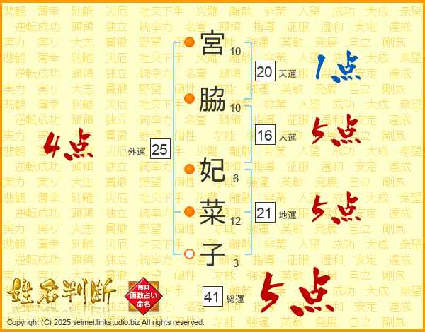 宮(10画)脇(10画) 妃(6画)菜(12画)子(3画)