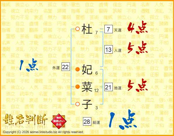 杜(7画) 妃(6画)菜(12画)子(3画)