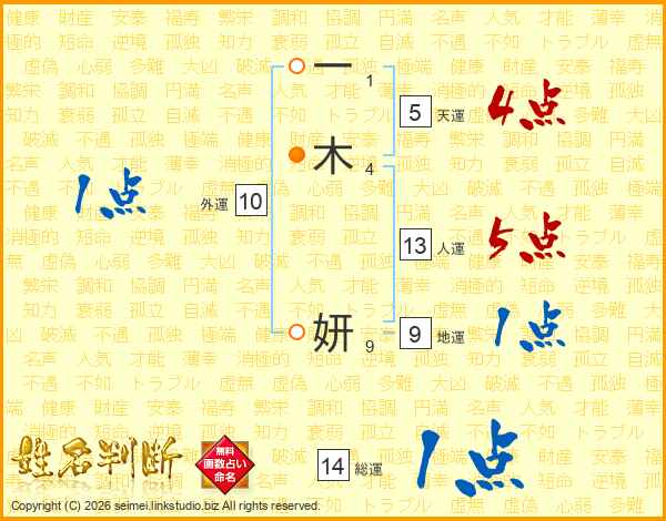 生活面を象徴する運勢です。外部から受ける影響力を表し、結婚運、家庭運や職場、環境への順応性を表します。総運から人運を引いた画数。姓や名が1文字の場合を除く。