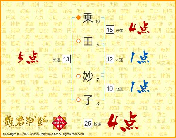 生活面を象徴する運勢です。外部から受ける影響力を表し、結婚運、家庭運や職場、環境への順応性を表します。総運から人運を引いた画数。姓や名が1文字の場合を除く。