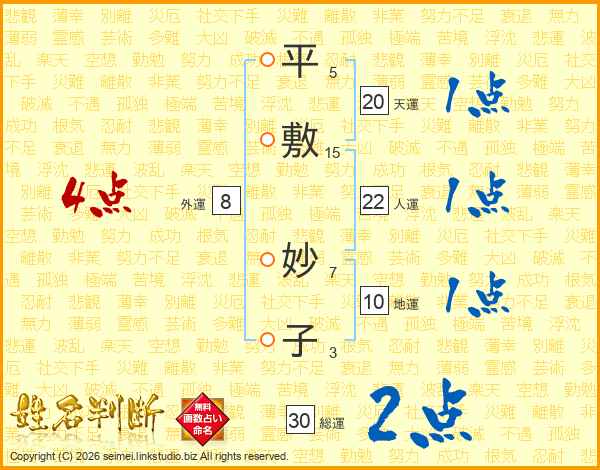 平(5画)敷(15画) 妙(7画)子(3画)