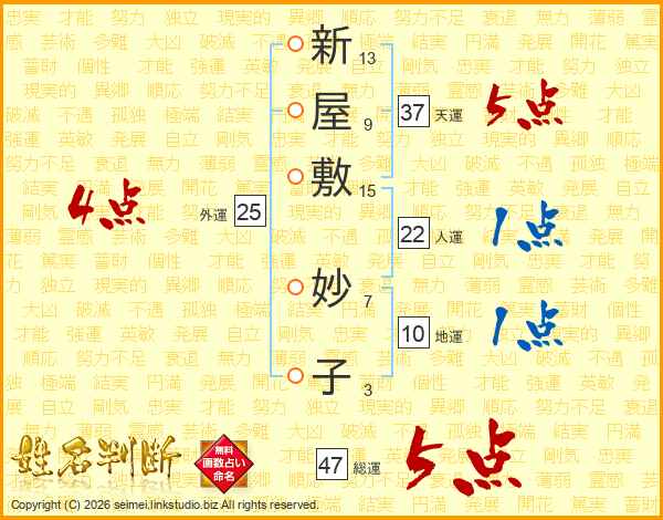 新(13画)屋(9画)敷(15画) 妙(7画)子(3画)