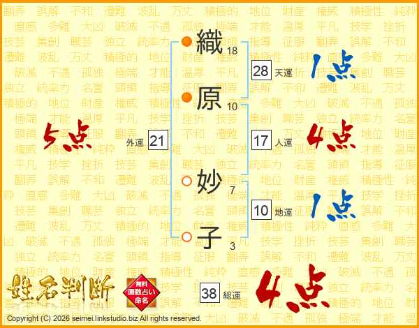 織(18画)原(10画) 妙(7画)子(3画)