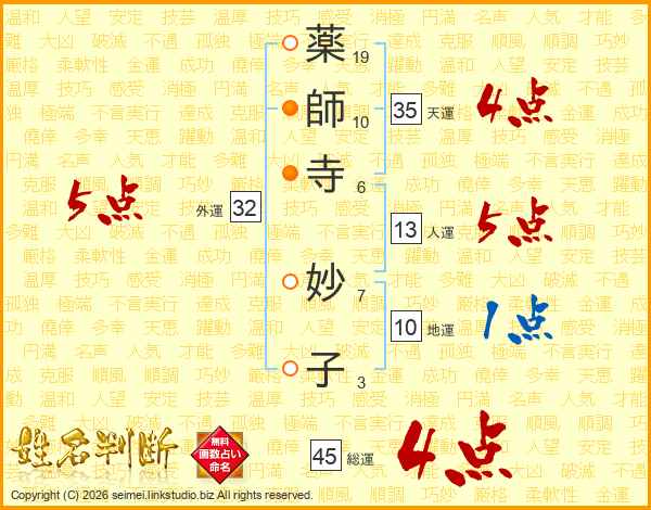 薬(19画)師(10画)寺(6画) 妙(7画)子(3画)