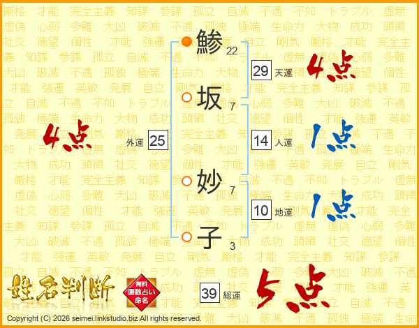 鯵坂妙子さんの総運は39画の5点!