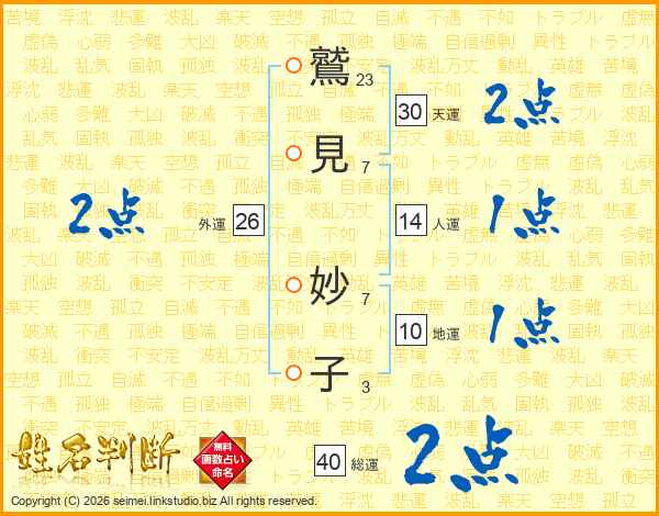 鷲(23画)見(7画) 妙(7画)子(3画)