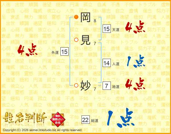 生活面を象徴する運勢です。外部から受ける影響力を表し、結婚運、家庭運や職場、環境への順応性を表します。総運から人運を引いた画数。姓や名が1文字の場合を除く。