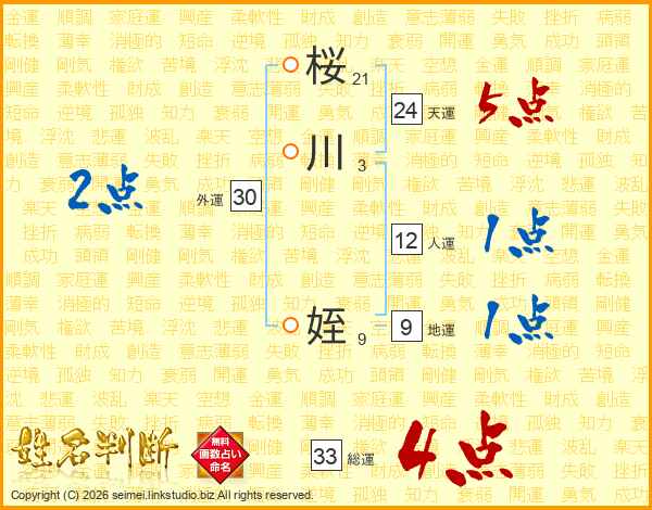 生活面を象徴する運勢です。外部から受ける影響力を表し、結婚運、家庭運や職場、環境への順応性を表します。総運から人運を引いた画数。姓や名が1文字の場合を除く。