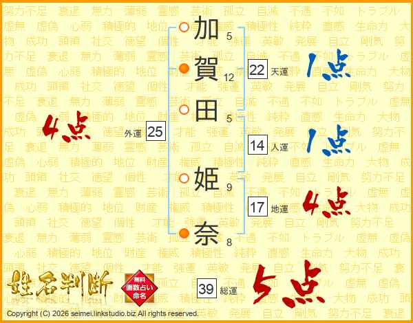加賀田姫奈さんの総運は39画の5点!