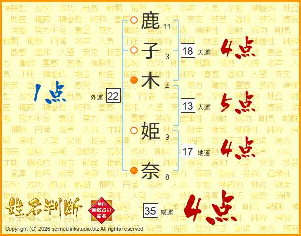鹿(11画)子(3画)木(4画) 姫(9画)奈(8画)