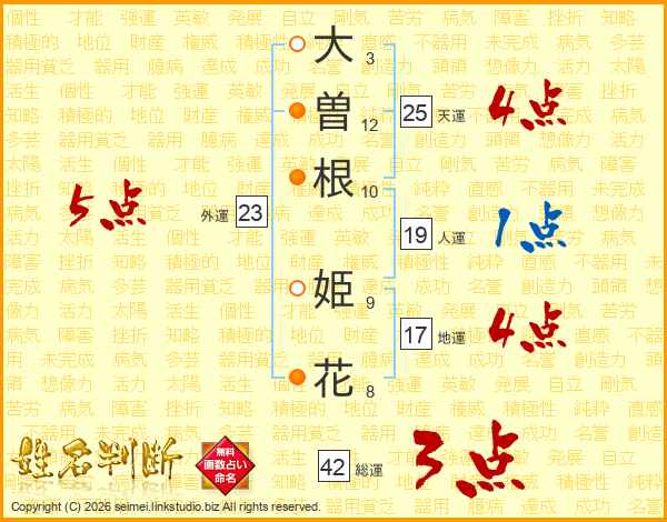 大(3画)曽(12画)根(10画) 姫(9画)花(8画)