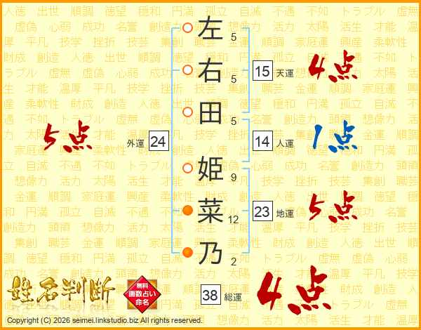 左右田姫菜乃さんの総運は38画の4点!