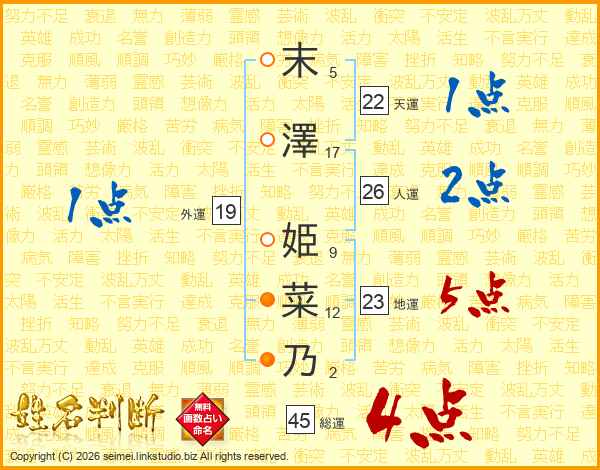 末(5画)澤(17画) 姫(9画)菜(12画)乃(2画)