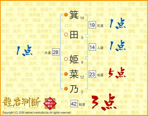 箕(14画)田(5画) 姫(9画)菜(12画)乃(2画)