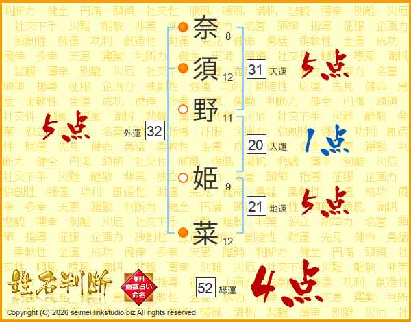 奈(8画)須(12画)野(11画) 姫(9画)菜(12画)
