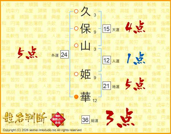久(3画)保(9画)山(3画) 姫(9画)華(12画)