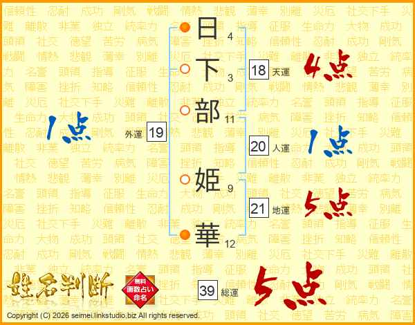 日(4画)下(3画)部(11画) 姫(9画)華(12画)