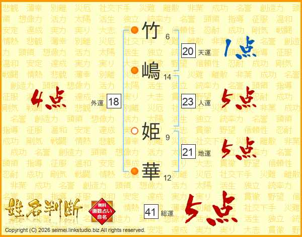 竹(6画)嶋(14画) 姫(9画)華(12画)