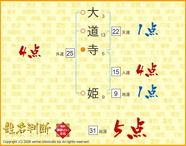 あなたの人生を表す1番重要な運勢です。生涯を通じて影響する総合運となり、主に50歳以降の晩年期に影響を及ぼします。苗字と名前の合計画数。