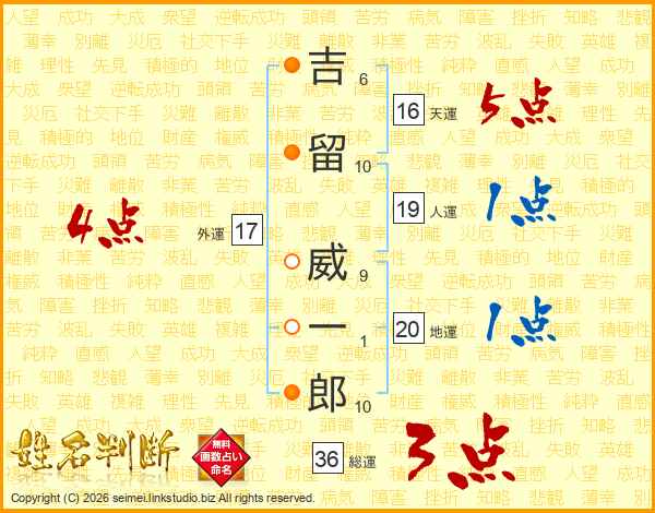 吉(6画)留(10画) 威(9画)一(1画)郎(10画)