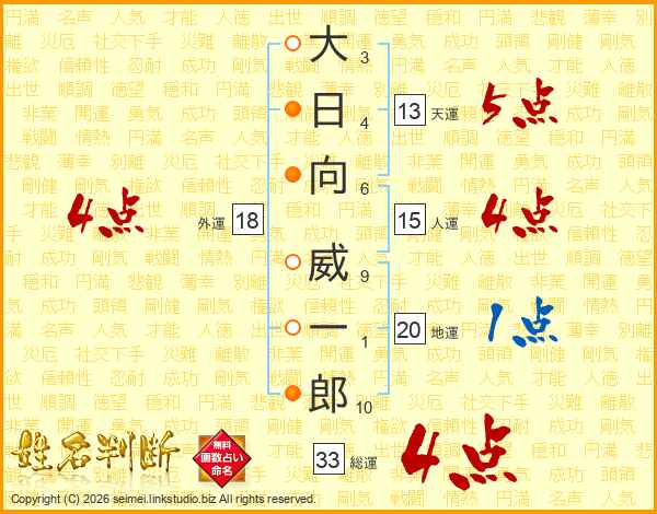 大(3画)日(4画)向(6画) 威(9画)一(1画)郎(10画)
