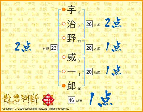 宇(6画)治(9画)野(11画) 威(9画)一(1画)郎(10画)