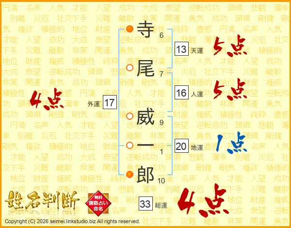 寺(6画)尾(7画) 威(9画)一(1画)郎(10画)