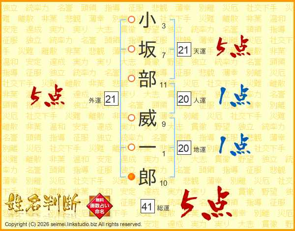 小(3画)坂(7画)部(11画) 威(9画)一(1画)郎(10画)