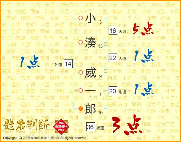 小(3画)湊(13画) 威(9画)一(1画)郎(10画)