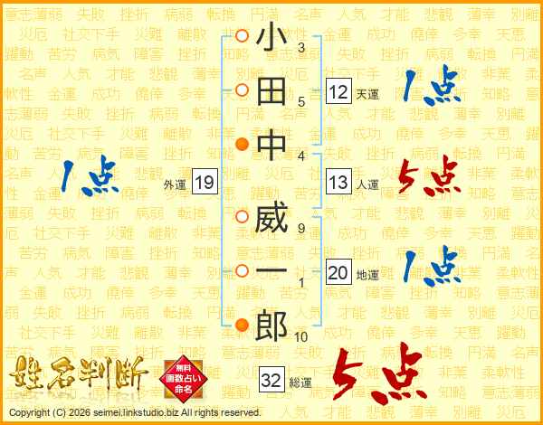 小(3画)田(5画)中(4画) 威(9画)一(1画)郎(10画)