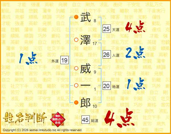 武(8画)澤(17画) 威(9画)一(1画)郎(10画)