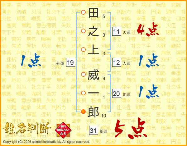 田(5画)之(3画)上(3画) 威(9画)一(1画)郎(10画)