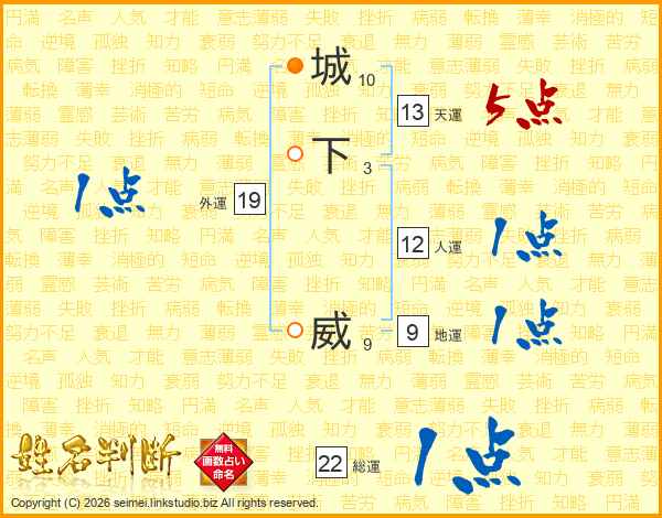生活面を象徴する運勢です。外部から受ける影響力を表し、結婚運、家庭運や職場、環境への順応性を表します。総運から人運を引いた画数。姓や名が1文字の場合を除く。