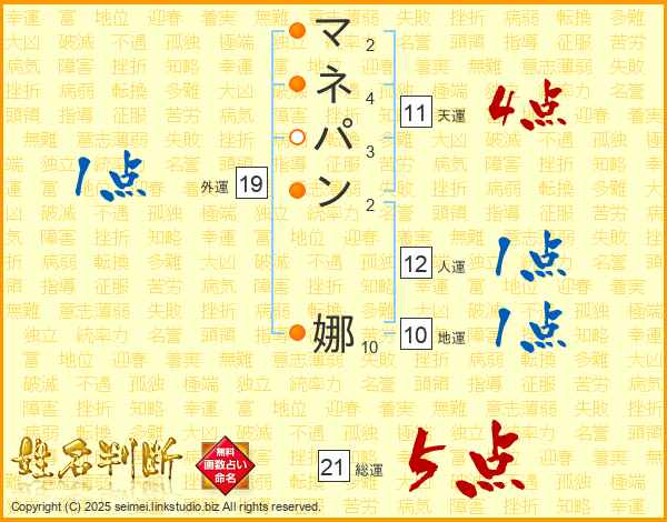 マ(2画)ネ(4画)パ(3画)ン(2画) 娜(10画)