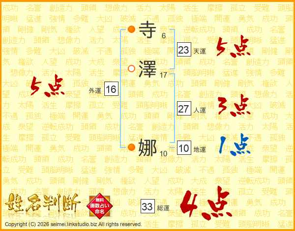 寺澤娜さんの総運は33画の4点!