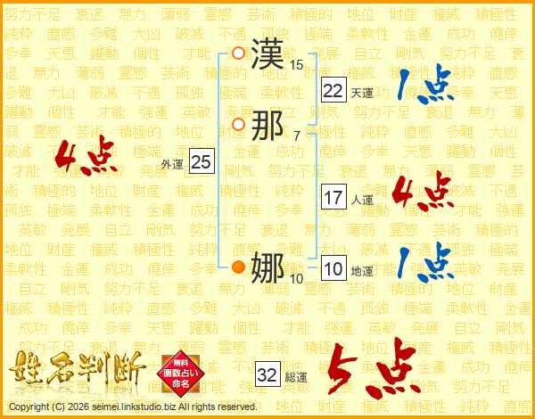 生活面を象徴する運勢です。外部から受ける影響力を表し、結婚運、家庭運や職場、環境への順応性を表します。総運から人運を引いた画数。姓や名が1文字の場合を除く。