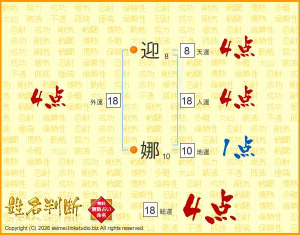 生活面を象徴する運勢です。外部から受ける影響力を表し、結婚運、家庭運や職場、環境への順応性を表します。総運から人運を引いた画数。姓や名が1文字の場合を除く。